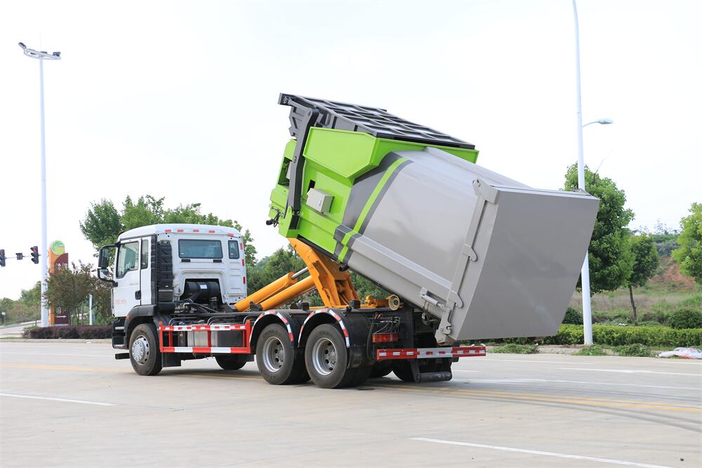 勾臂式垃圾車(車廂可卸式垃圾車)介紹: 車廂可卸式垃圾車又叫拉臂式垃圾車,是一種采用高新設計可伸縮的鉤臂,實現(xiàn)垃圾廂的二次吊裝,自吊上放下,可自行傾倒垃圾的環(huán)衛(wèi)設備。 拉臂式垃圾車結構簡單,操作穩(wěn)定方便,裝卸效率高,機械化程度高,節(jié)省人力。鉤臂垃圾車一車可帶多個垃圾廂,在裝卸的運輸過程中可有效地避免二次污染。 拉臂垃圾車采用高新設計可擺動的鉤臂,垃圾箱由框架、開啟油缸、滑輪、后門和若干加強框架與鋼板焊接而成。調換貨廂快捷方便,貨廂上帶蓋(倒垃圾時可翻開),鉤臂垃圾車垃圾廂體可選用碳鋼、不銹鋼材質、內部采取環(huán)氧樹脂防腐處理,改裝部分與原車底盤為可分離式,維修方便且保持了原車的機動性及行駛性能。