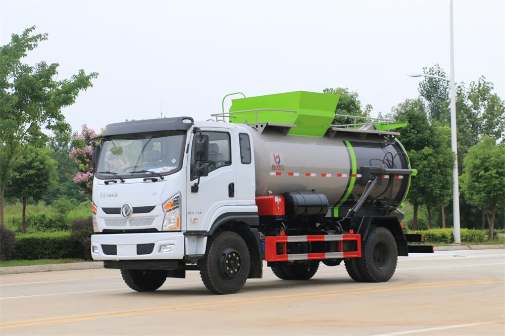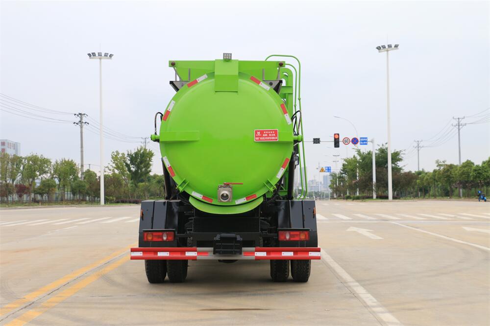 上裝配置:罐體容積10m3,配備120L/240L掛桶提升翻轉機構,液壓系統,后蓋液壓鎖緊開啟,罐體可以舉升自卸,尾部帶自流閥;用于運輸液態垃圾,其特點操作簡單,密封性好,無泄漏,無異味;可選裝固液分離功能,推板擠壓功能,常用于餐館的垃圾轉運處理。