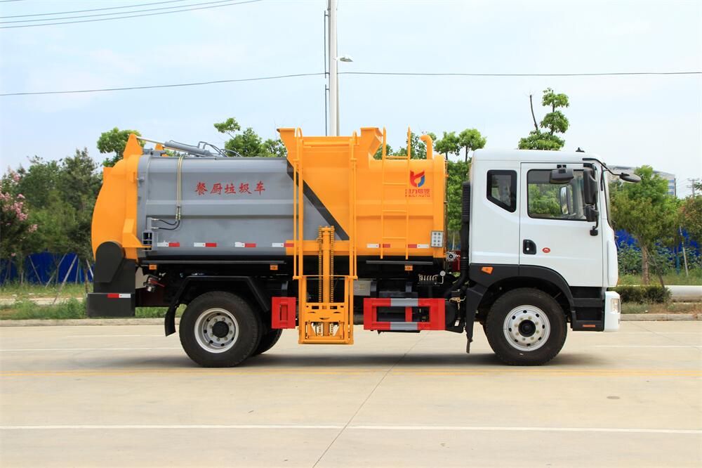 上裝配置:罐體容積10m3,配備120L/240L掛桶提升翻轉機構,液壓系統,后蓋液壓鎖緊開啟,罐體可以舉升自卸,尾部帶自流閥;用于運輸液態垃圾,其特點操作簡單,密封性好,無泄漏,無異味;可選裝固液分離功能,推板擠壓功能,常用于餐館的垃圾轉運處理。