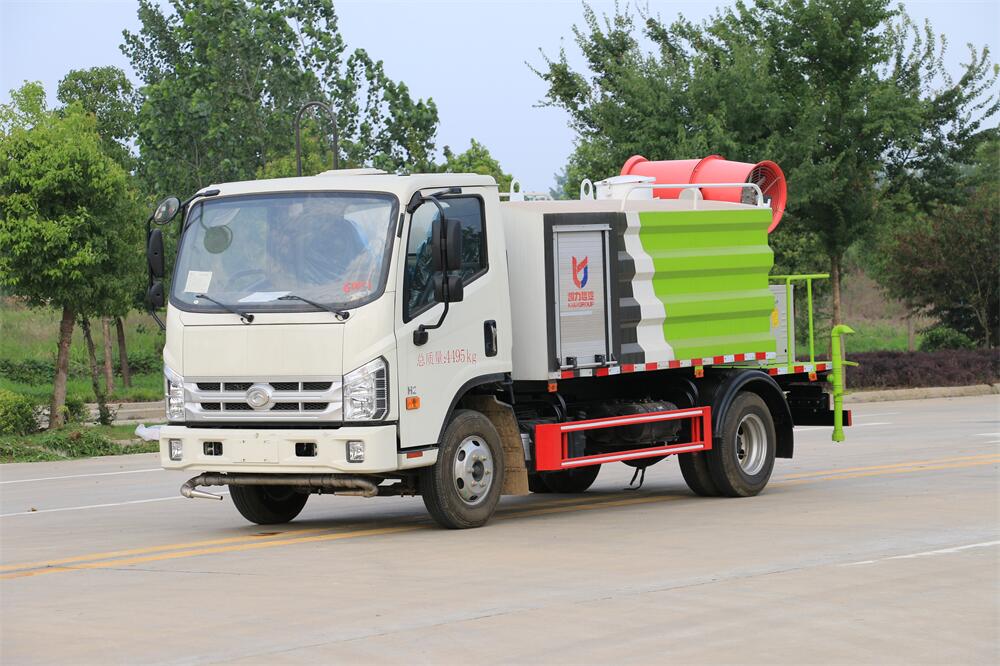 上裝配置:罐體容積為 5立方,選配風送式霧炮機組射程30米、40米、50米、60米、80米、100米、120米霧炮,罐體鋼板為4mm碳鋼Q235材質,罐內隔板具有防波作用,以減輕汽車行駛時罐體液體沖擊,罐體及整車外形尺寸按照公告。帶大功率專用灑水泵,泵可自吸自排,整車前沖、后灑、側噴、帶65消防接口,后平臺配CLW-50、CLW-60、CLW-80、CLW-100、CLW-120型風送式霧炮機組;罐體前封頭配大功率柴油發電機組;前封頭帶水位計,后平臺主管路帶1寸澆花接口,后爬梯。帶兩根輸水管及陰陽端。罐體顏色:銀/灰/綠,罐體兩側噴“多功能抑塵車”字樣,貼反光標示。