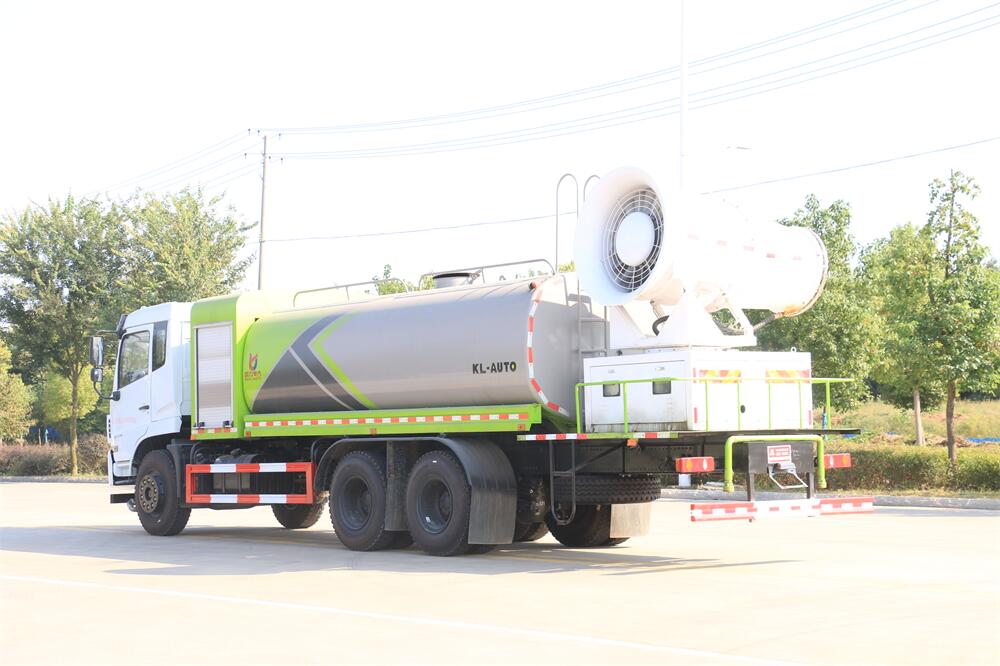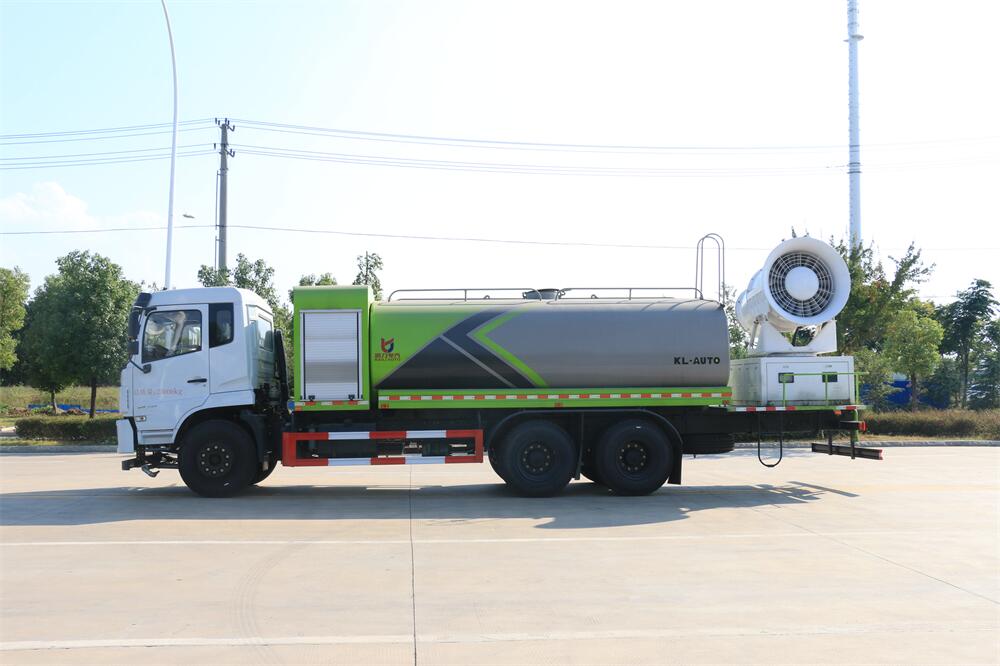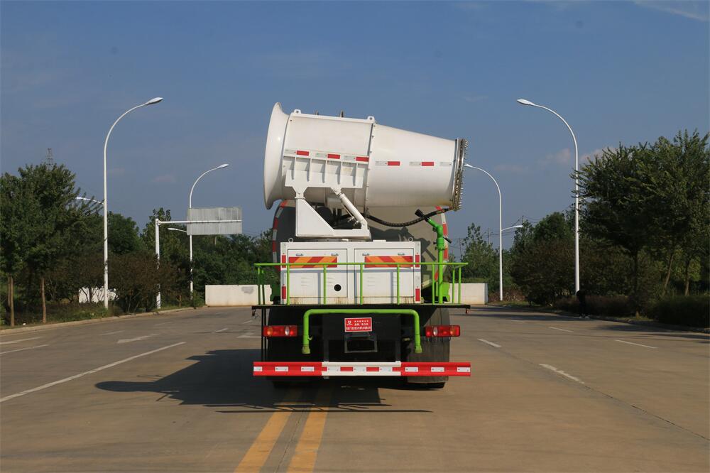 上裝配置:罐體容積為 16立方,選配風送式霧炮機組射程30米、40米、50米、60米、80米、100米、120米霧炮,罐體鋼板為4mm碳鋼Q235材質,罐內隔板具有防波作用,以減輕汽車行駛時罐體液體沖擊,罐體及整車外形尺寸按照公告。帶大功率專用灑水泵,泵可自吸自排,整車前沖、后灑、側噴、帶65消防接口,后平臺配CLW-50、CLW-60、CLW-80、CLW-100、CLW-120型風送式霧炮機組;罐體前封頭配大功率柴油發電機組;前封頭帶水位計,后平臺主管路帶1寸澆花接口,后爬梯。帶兩根輸水管及陰陽端。罐體顏色:銀/灰/綠,罐體兩側噴“多功能抑塵車”字樣,貼反光標示。