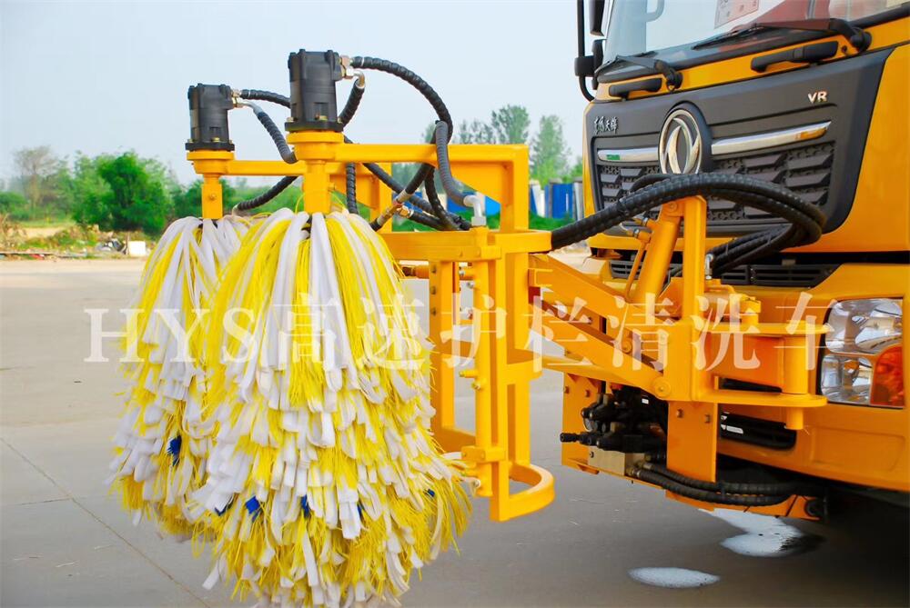 在行駛過程中,噴嘴向護欄進行低壓噴水沖洗護欄,然后四個馬達帶著滾刷旋轉并夾著護欄對護欄進行滾動清洗作業。