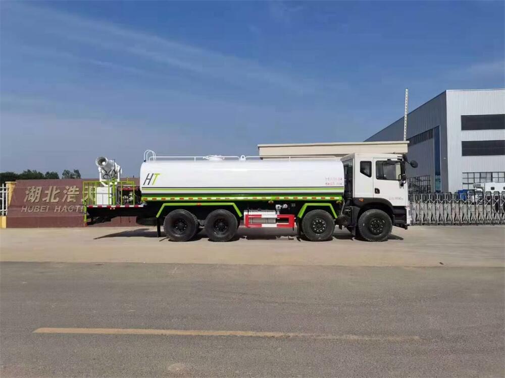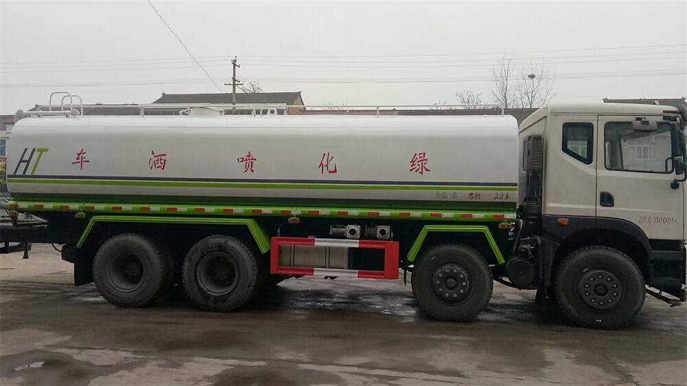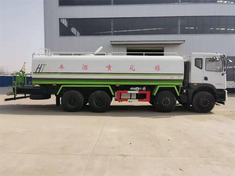 灑水車前裝有鴨形噴嘴或圓頭沖嘴,后面裝有圓柱開(kāi)灑水噴嘴或蓮蓬頭噴嘴,后部有一工作平臺(tái),裝配有水炮。后部還可裝8個(gè)噴嘴(選裝)。